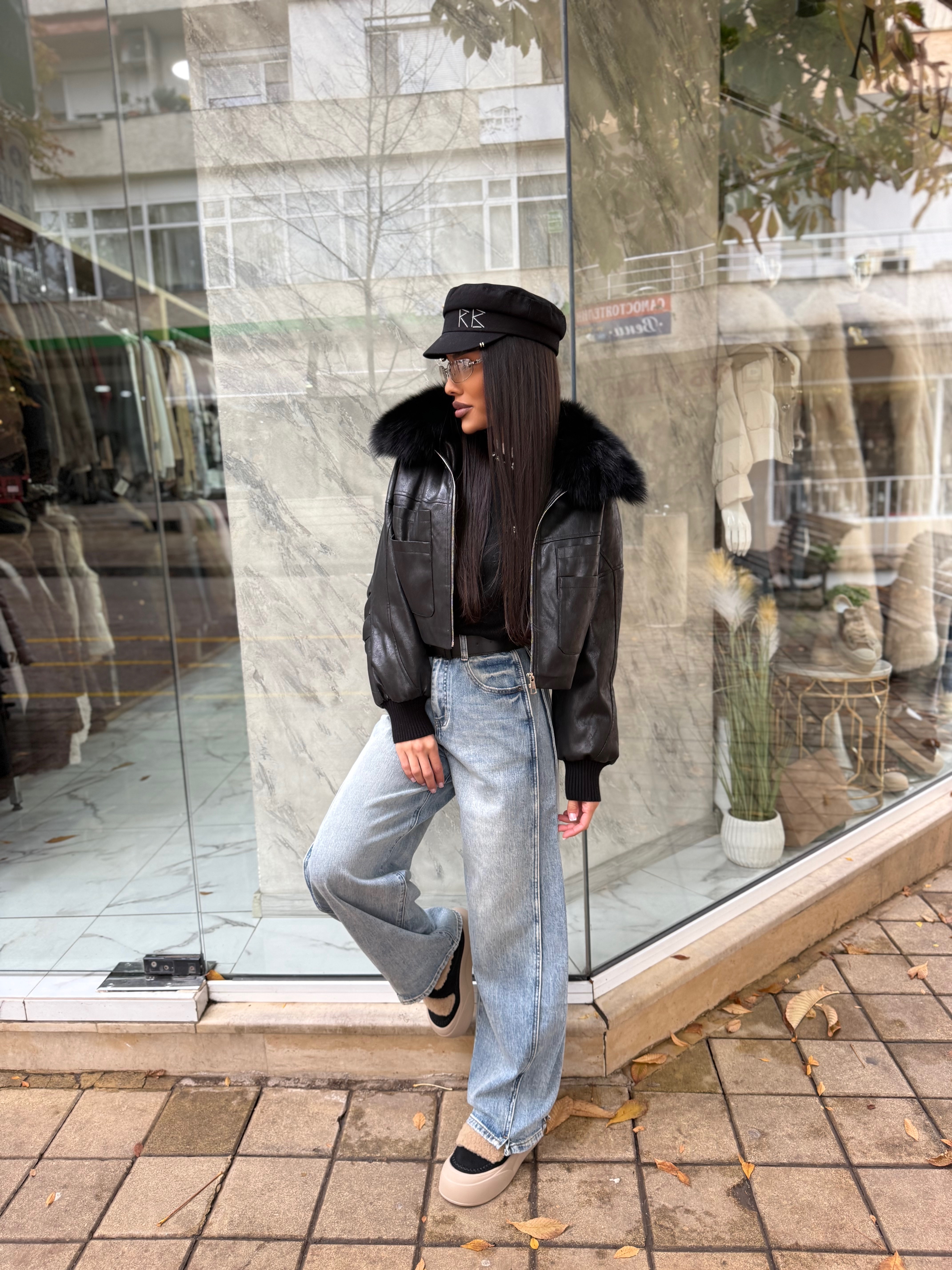 Визията включва черно яке с видима пухена яка и централен цип. Якетo има предни джобове и рипсени маншети на ръкавите. Черна шапка с бяла бродерия (инициали RK) и прозрачни очила допълват аутфита. Светъл деним на дънките създава контраст с тъмната горна част.