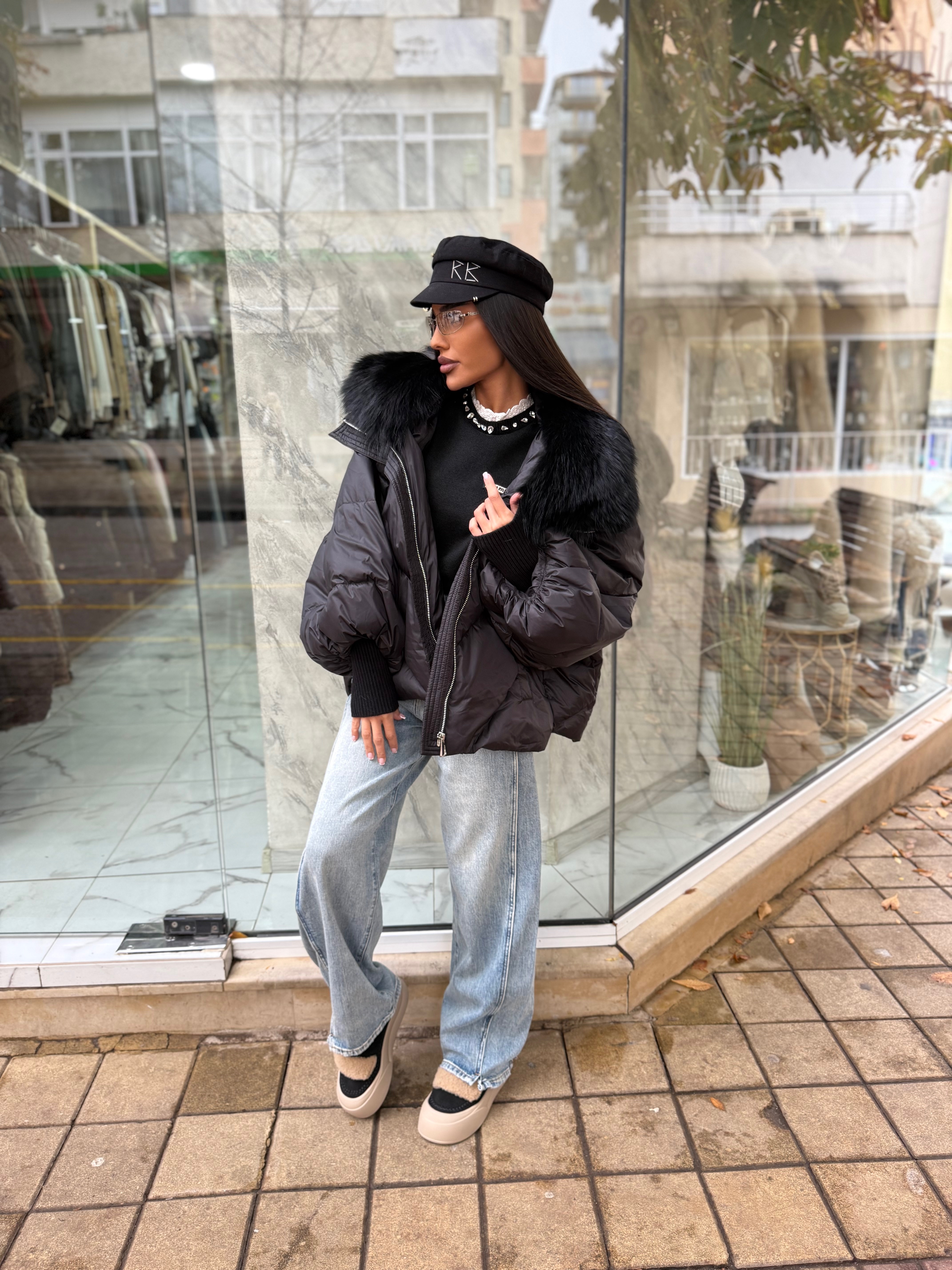 Дамско черно яке с пухена яка и шапка с бродерия | ASTYLE