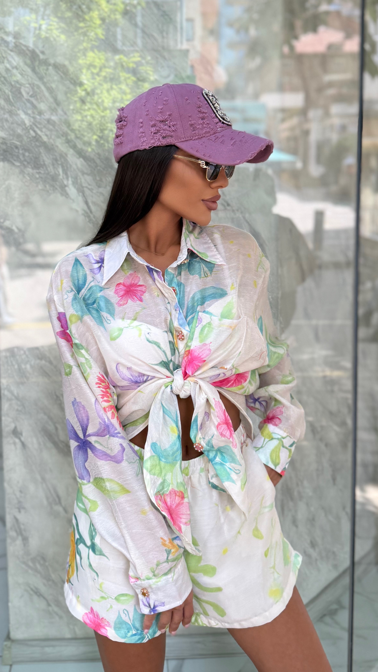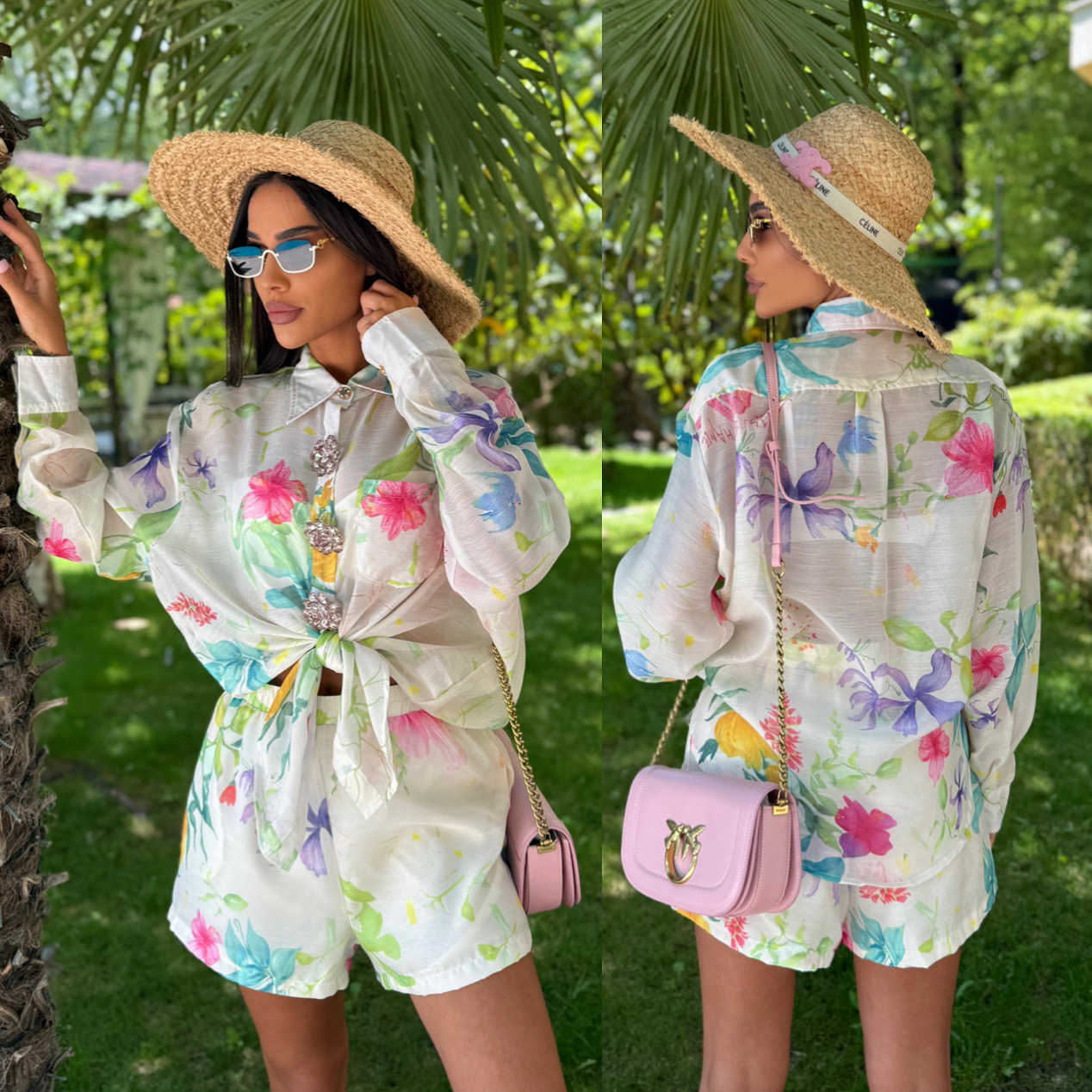 Този комплект включва риза с дълги ръкави и къси панталони, идеални за топлите летни дни. Изработен е от лека и дишаща материя, която осигурява комфорт и стил. Целият комплект е украсен с живи цветя, което го прави перфектен за плаж или разходка из града.