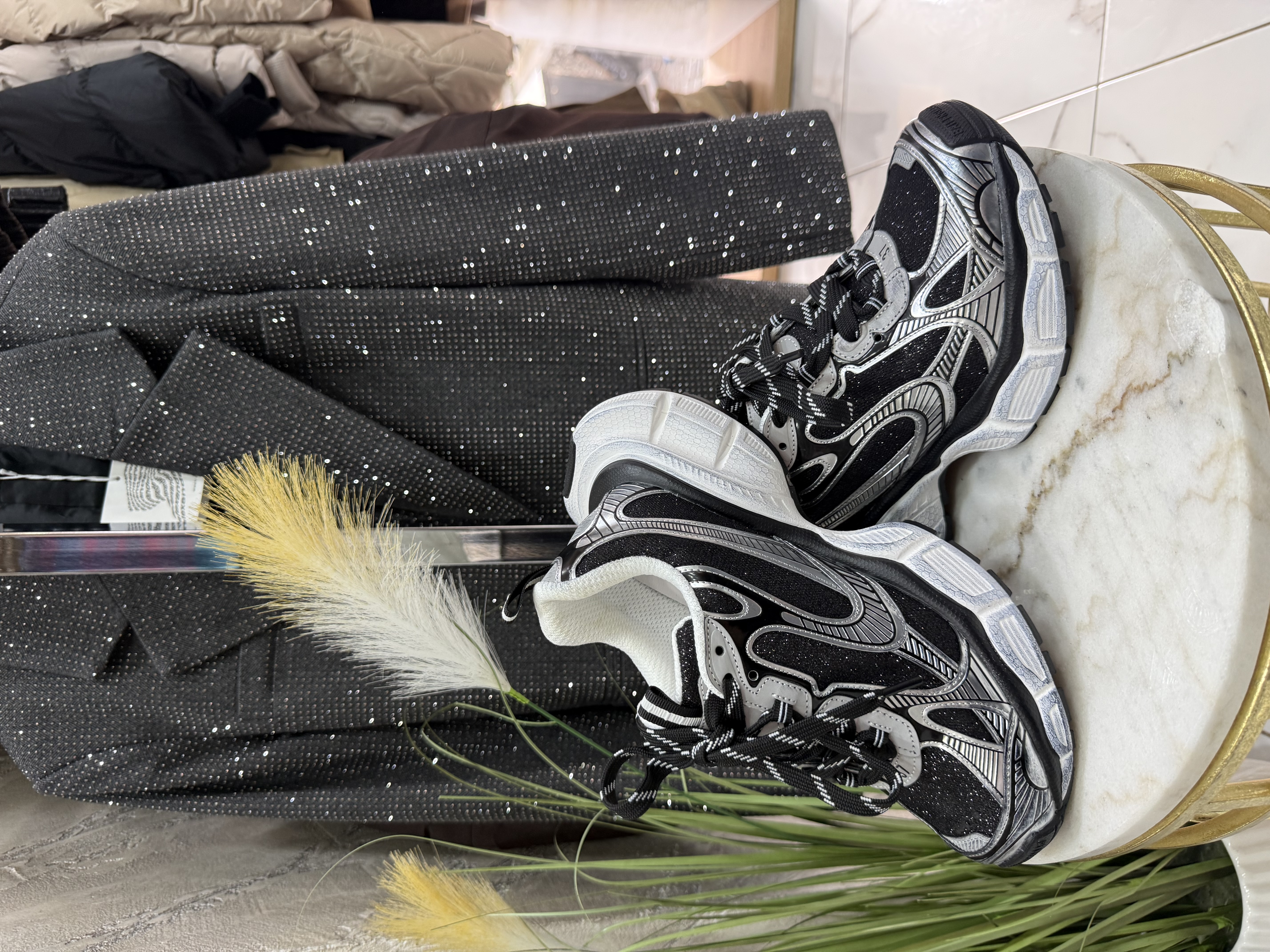 Черни маратонки със сребристи акценти и блестящ ефект. Имат шарени шнурове и подплатена бяла вътрешност. Маратонките са с черно основно тяло и видими сребристи декоративни елементи. Повърхността има блестящ ефект, забележими малки искри. Дебелата бяла подметка е с релефни панели и структура. В горната част се вижда подплатена бяла яка и издърпваща лента на петата.